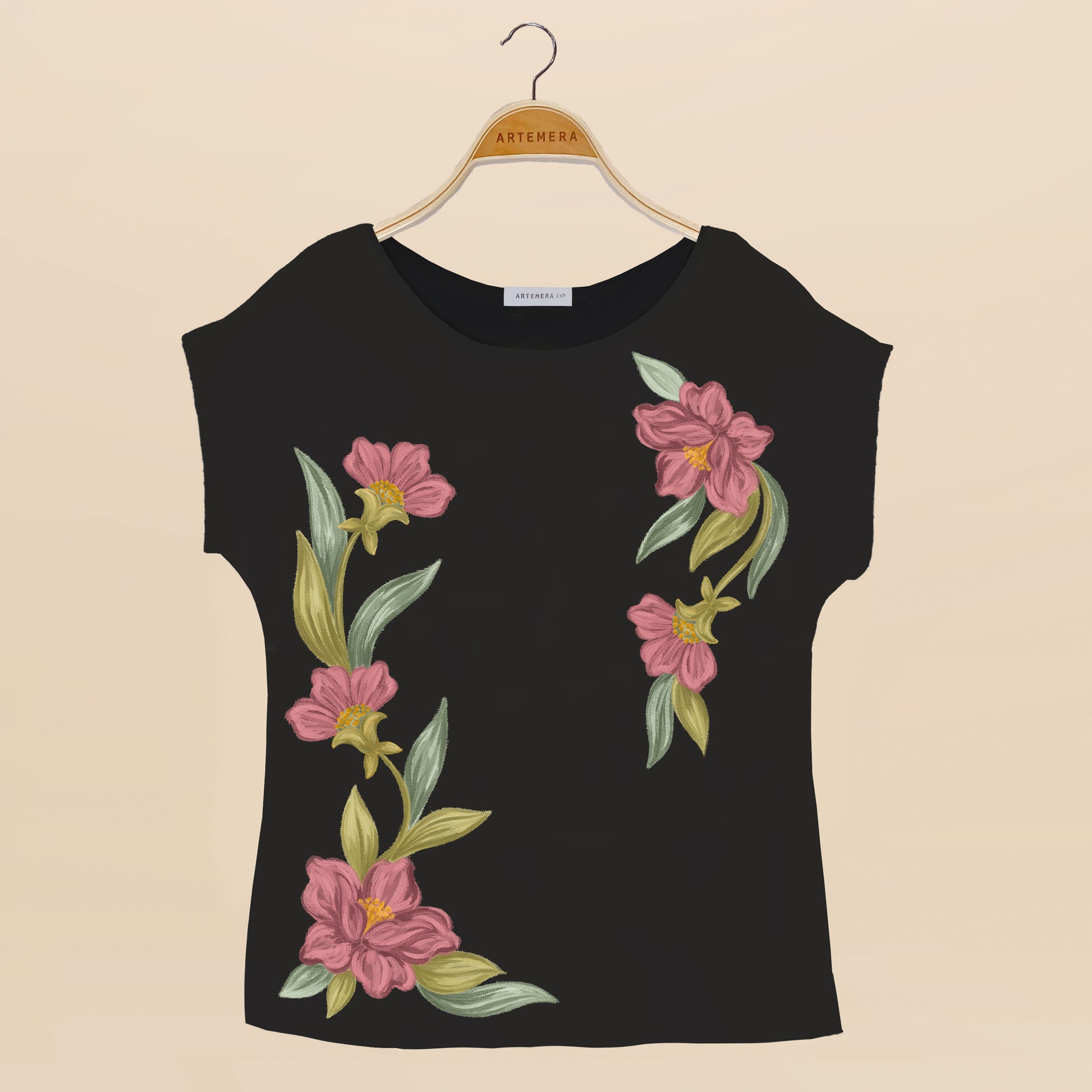 Diseño con trazos como nos encanta 😍 En nuestra blusa negra de manga japonesa y tajos a los lados.