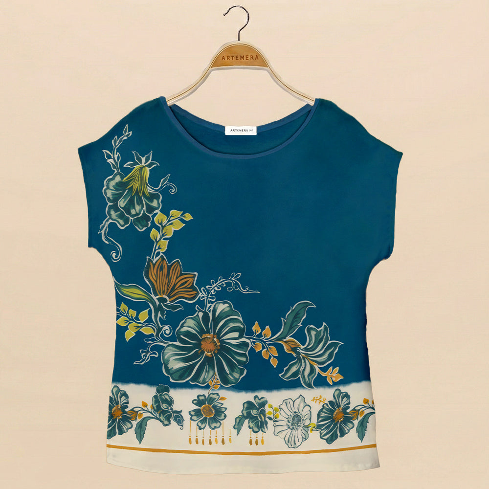 Blusa con mangas japonesas y tajos a los lados 😍 Con flores y hojas en tonos mostaza y verde que contrastan con un azul intenso y elegante. 🍃 Diseño 360, con estampa al frente y atrás :)