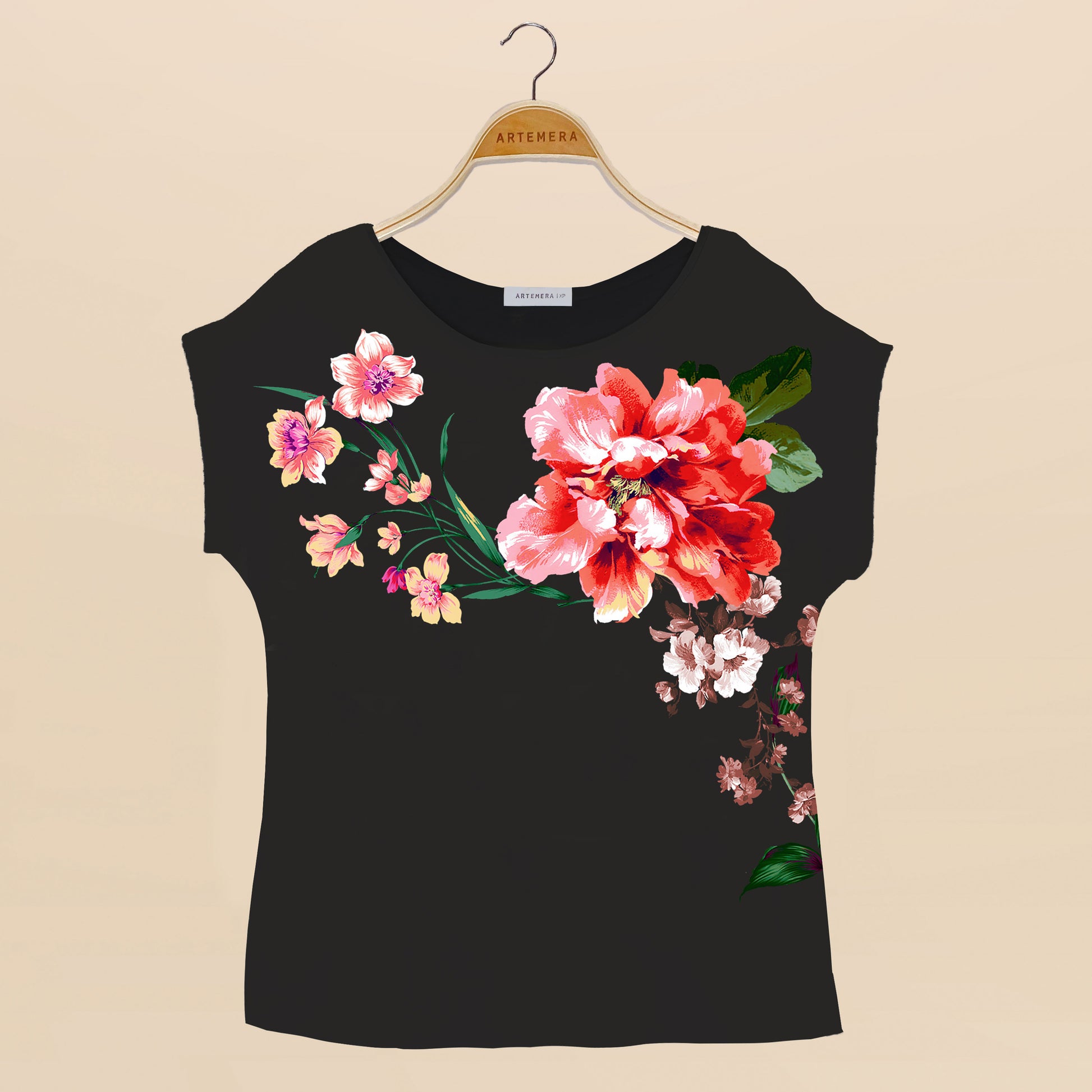 Diseño con flores en nuestra blusa negra de manga japonesa y tajos a los lados :)