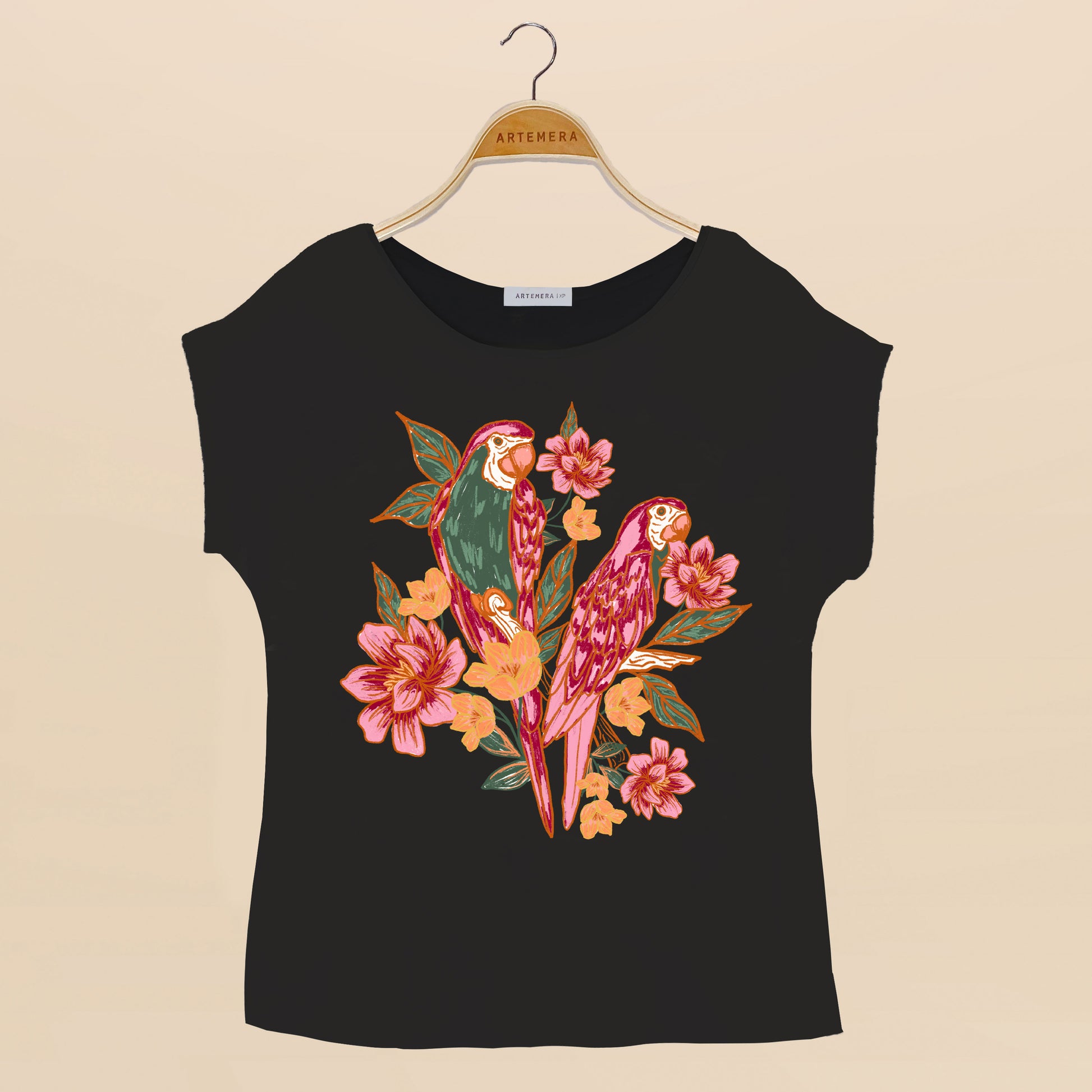 Diseño con estampado de flores y papagayos flores en nuestra blusa negra de manga japonesa y tajos a los lados :)