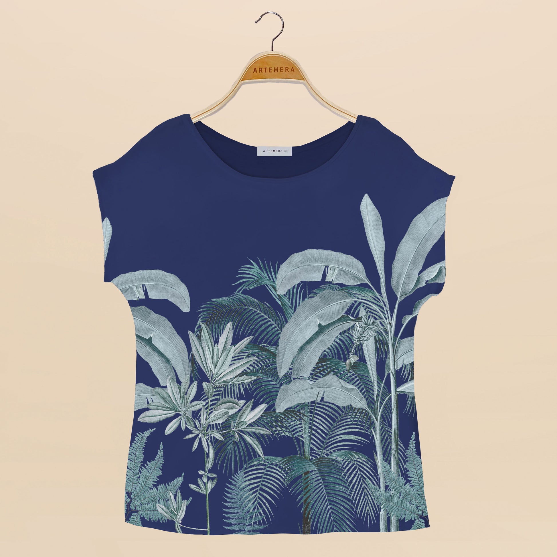 Diseño de palmeras que se estampa en nuestra blusa azul de manga japonesa y tajos a los lados.
