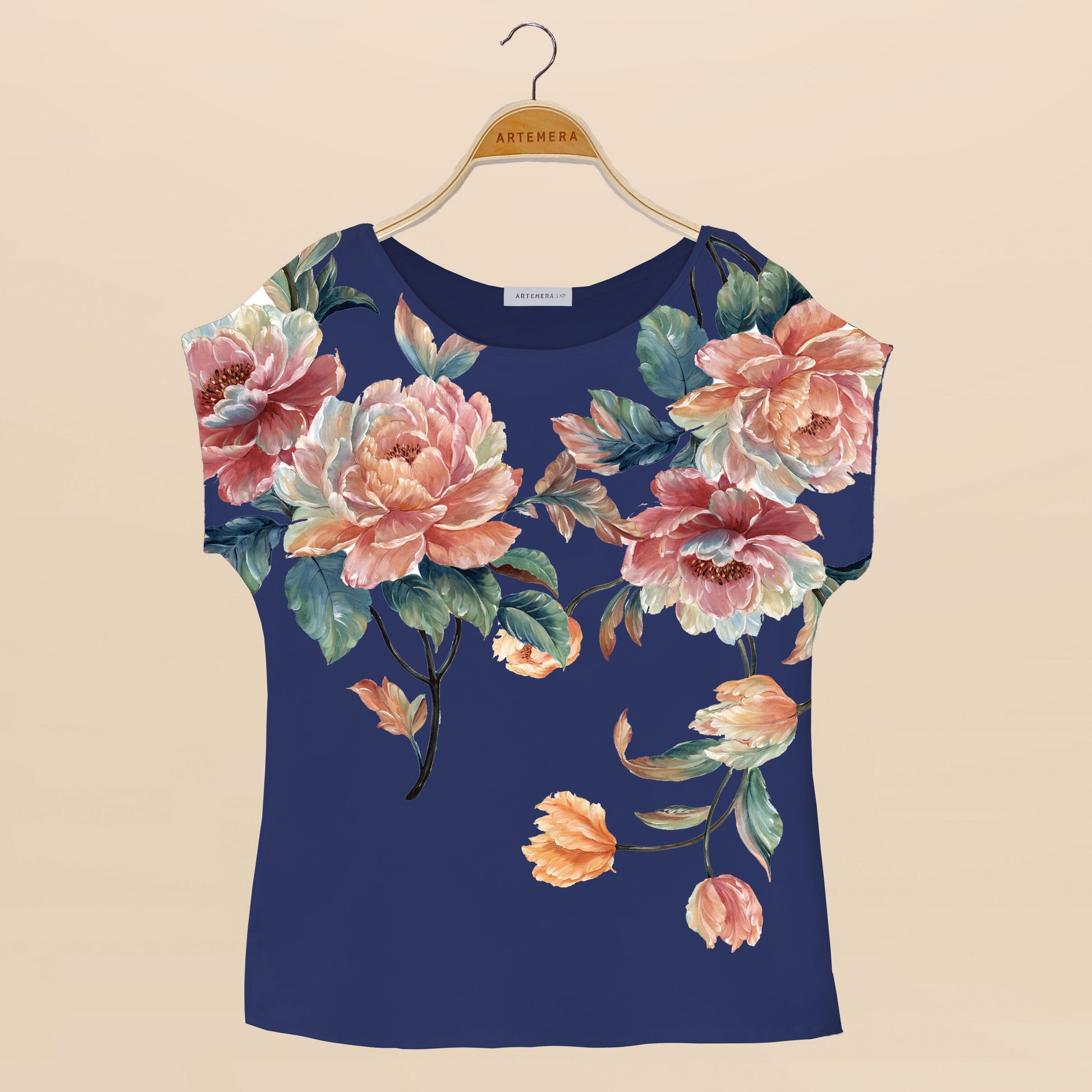 Diseño floral y colorido que se estampa en la blusa azul de manga japonesa y tajos a los lados :)