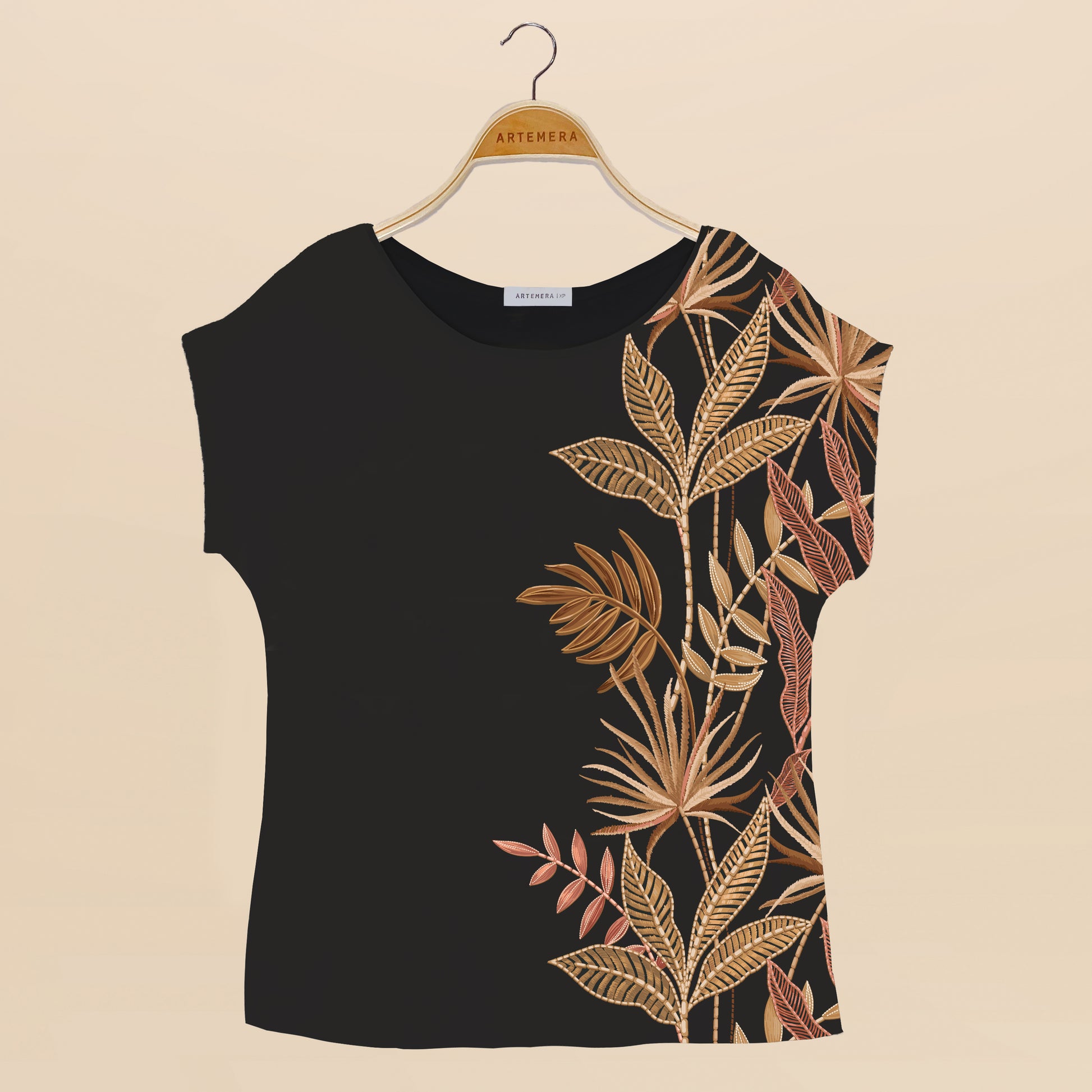 Diseño con trazos como nos encanta 😍 En nuestra blusa negra de manga japonesa y tajos a los lados.