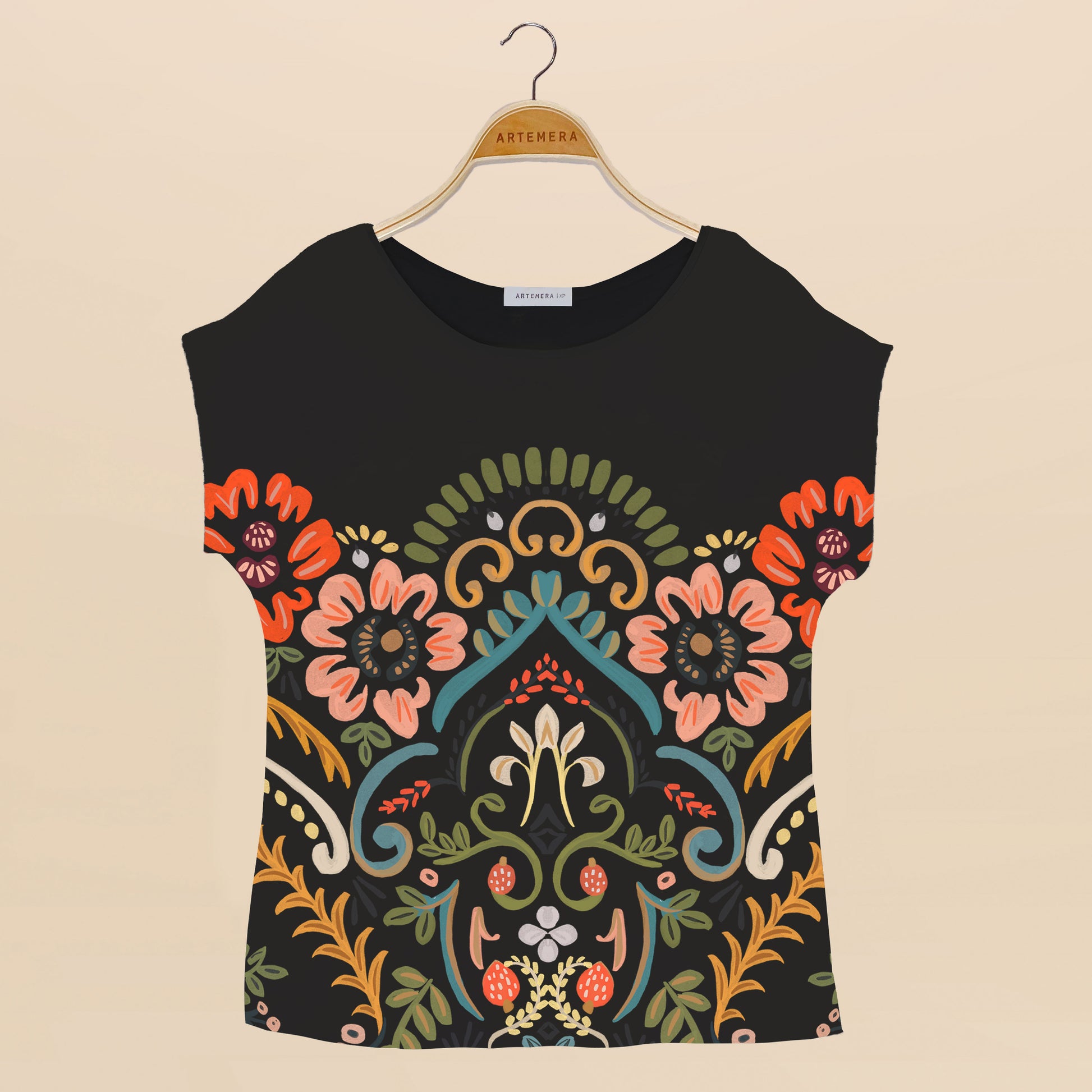 Diseño floral en el centro estampado en nuestra blusa negra, de mangas japonesas y tajos a los lados :)