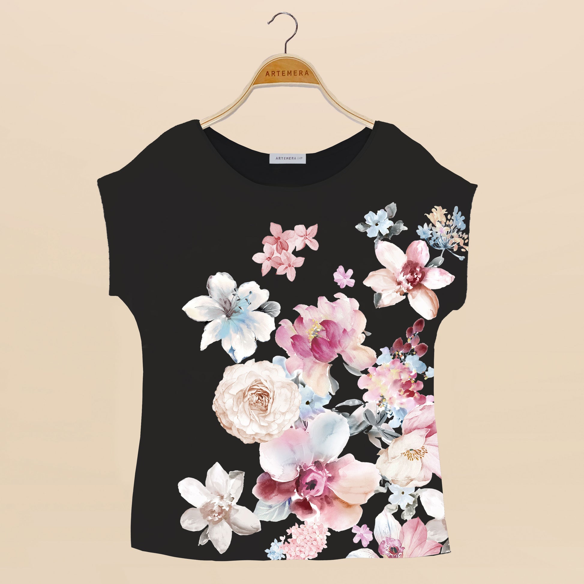 Diseño floral a los costados para nuestra blusa negra de manga japonesa y tajos a los lados :)