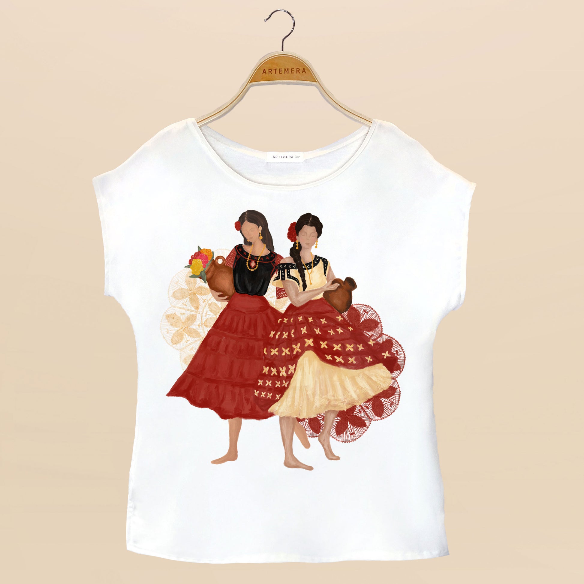 Blusa para mujer con diseño de bailarinas paraguayas.