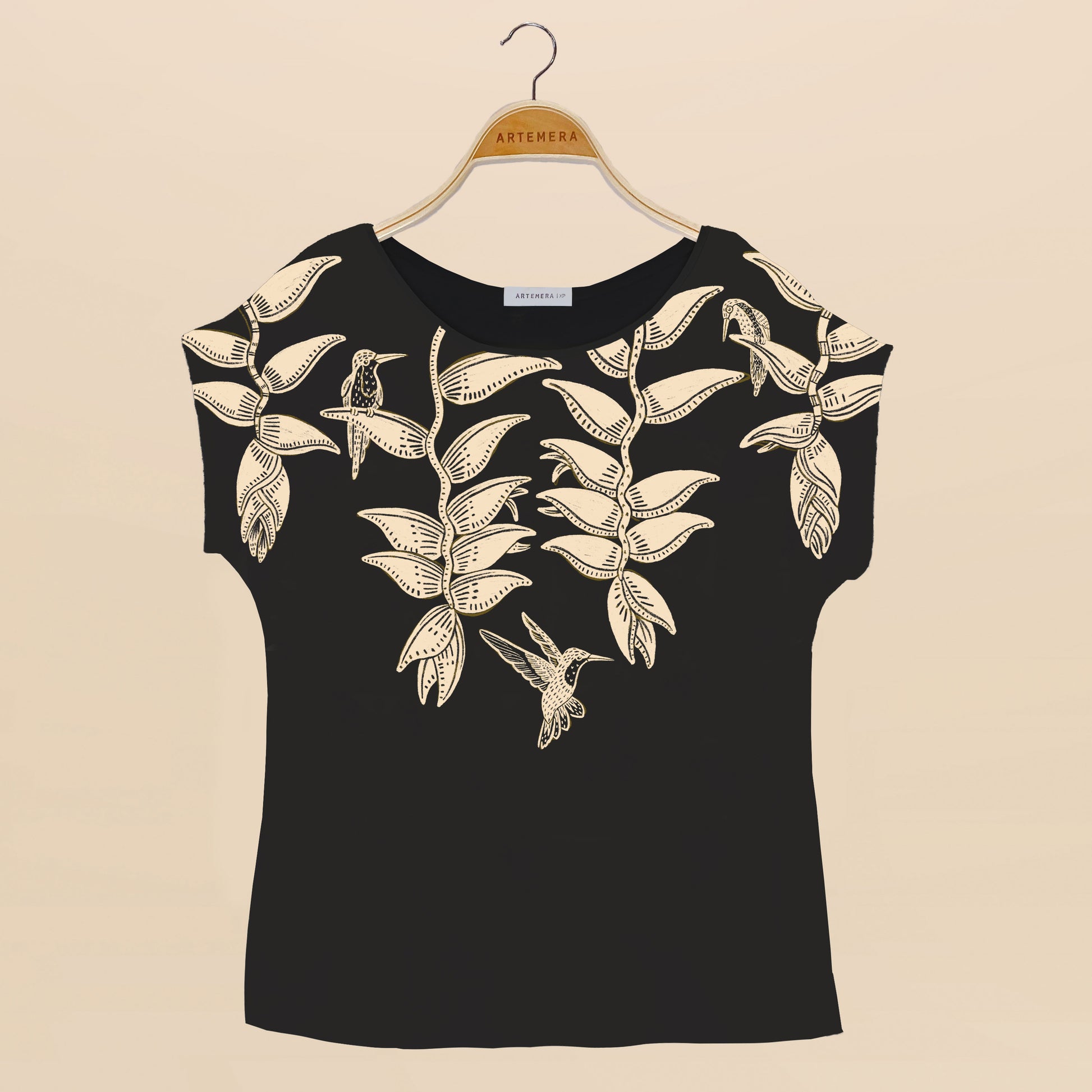 Diseño monocromático en blusa negra con heliconias blancas, creado por la artista Ile Heinrich con intervenciones de Artemera.