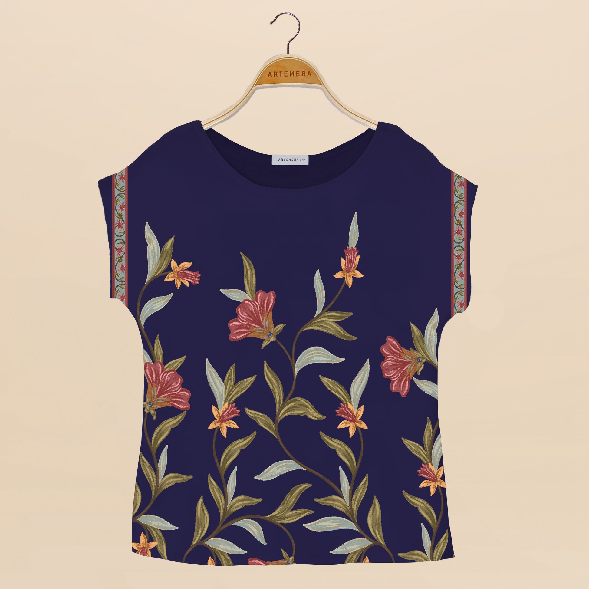 Diseño con trazos florales como nos encanta 😍 En nuestra blusa azul de manga japonesa y tajos a los lados.