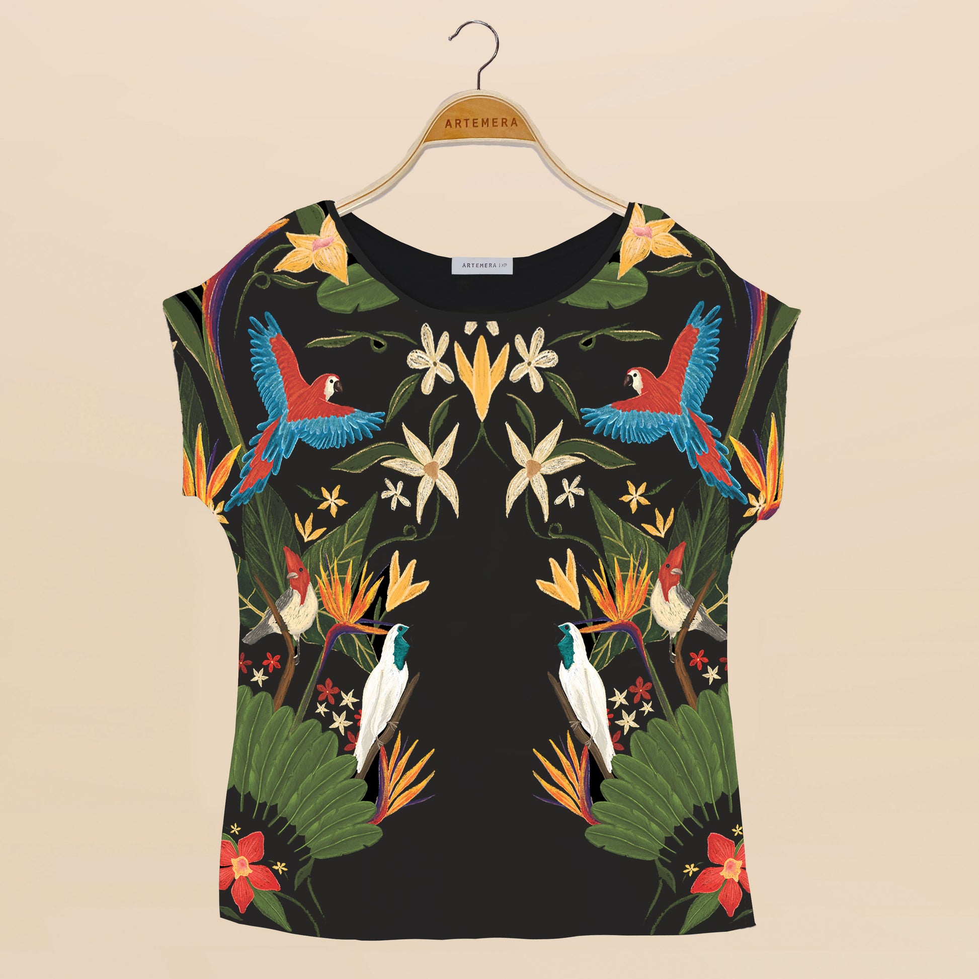 Nuestro diseño "Jungla" es un estampado exclusivo de Artemera. Creado por la artista paraguaya Ile Heinrich, en la blusa negra de manga japonesa y tajos a los lados :)