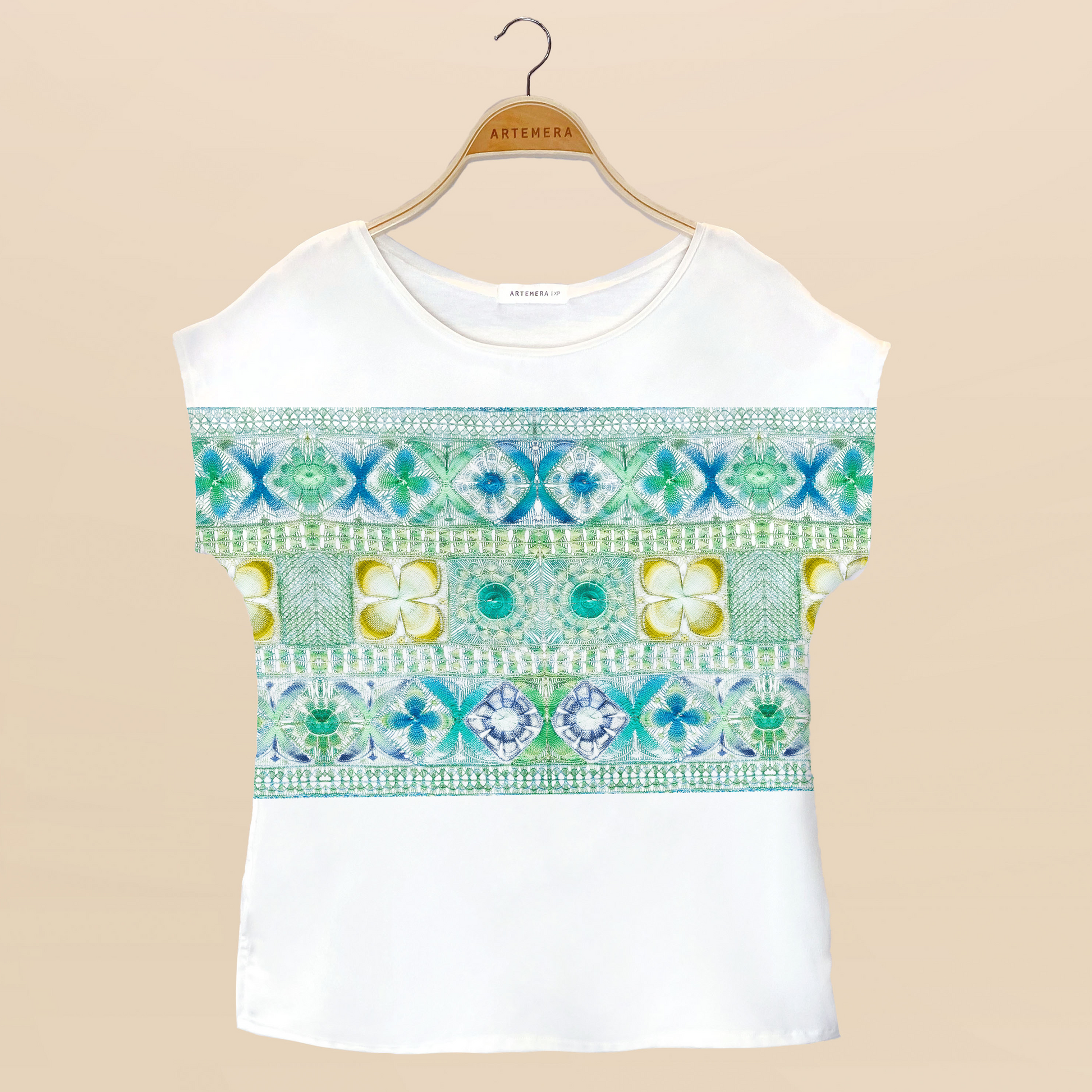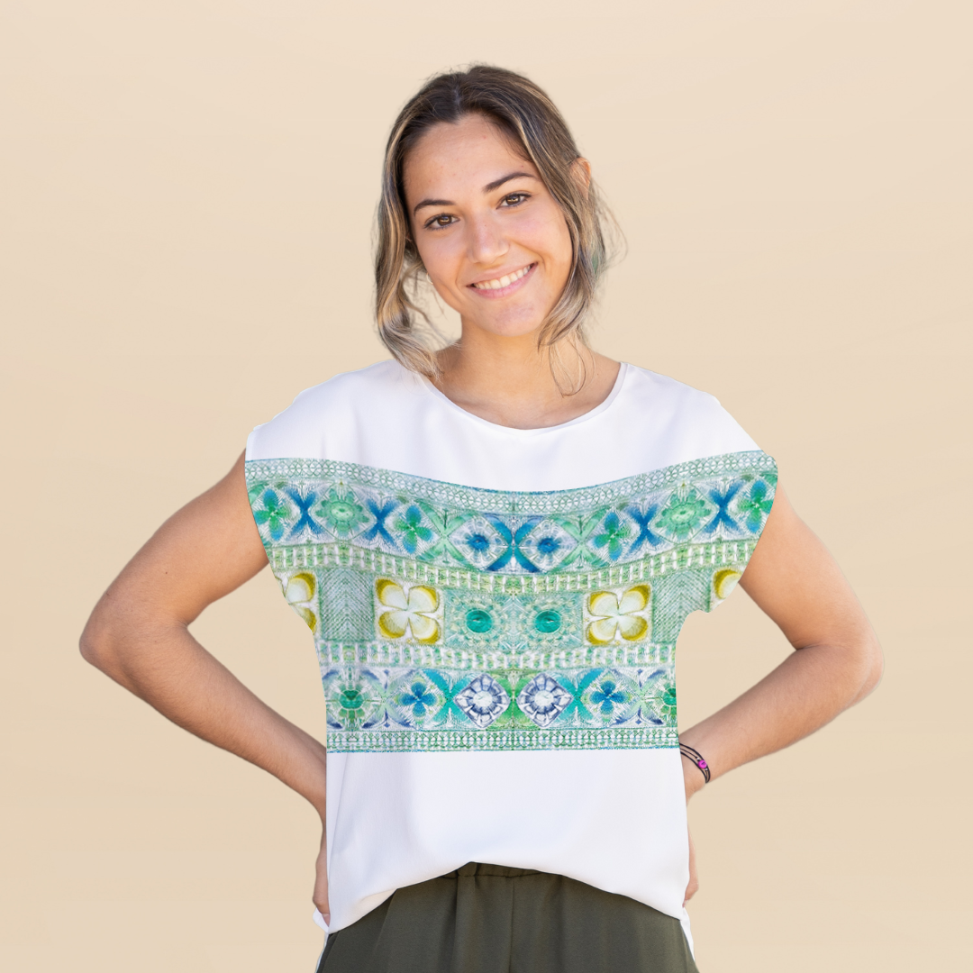 Blusa para mujer con randa de ñandutí sublimada en el centro, en tonos verde agua y azul.