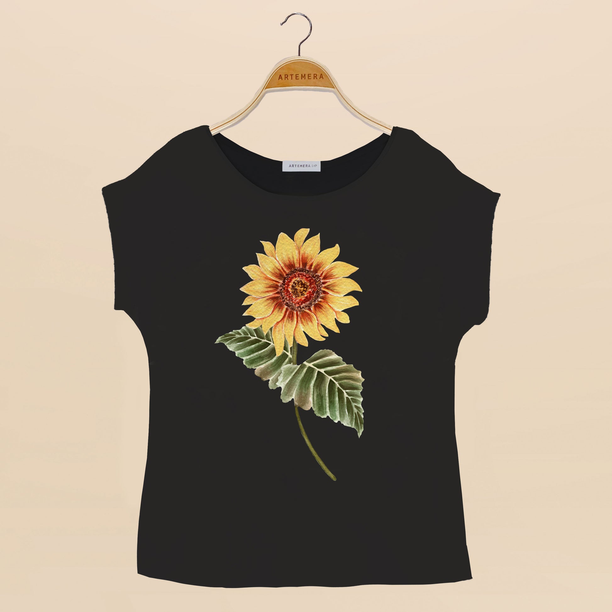 Diseño floral que se estampa en la blusa negra de manga japonesa y tajos a los lados :)