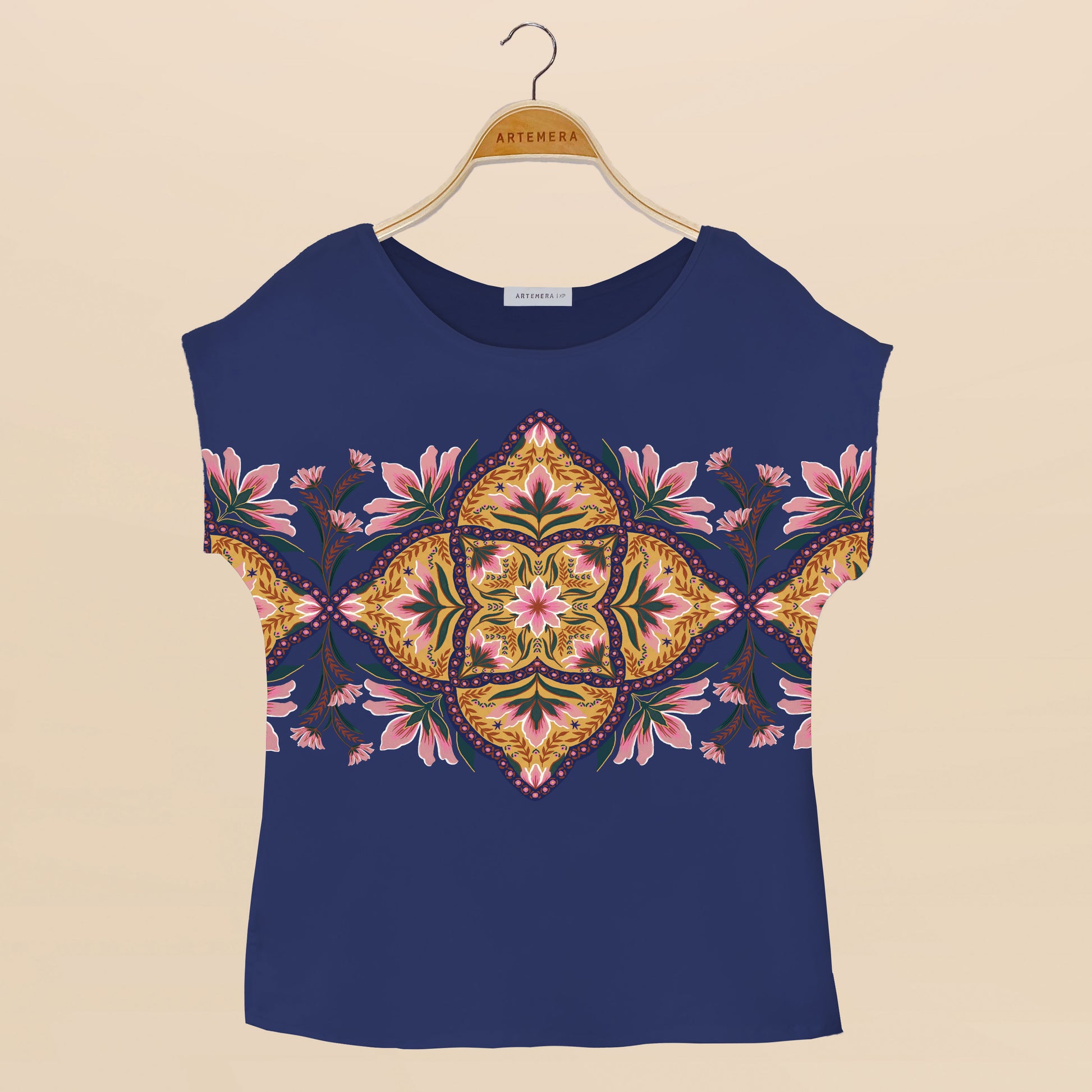 Diseño floral geométrico que se estampa en nuestra blusa azul de manga japonesa y tajos a los lados :)