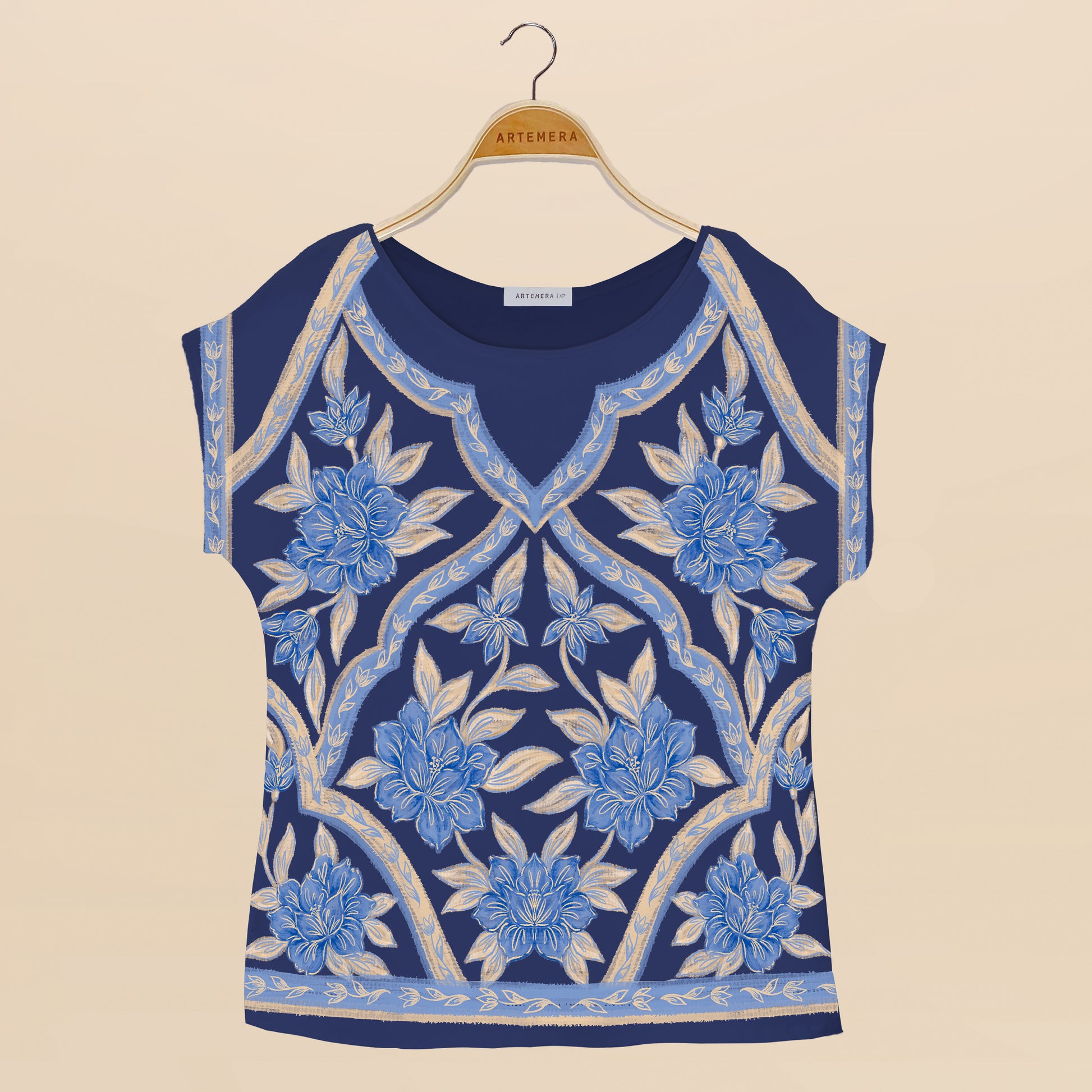 Diseño con trazos florales como nos encanta 😍 En nuestra blusa azul de manga japonesa y tajos a los lados.