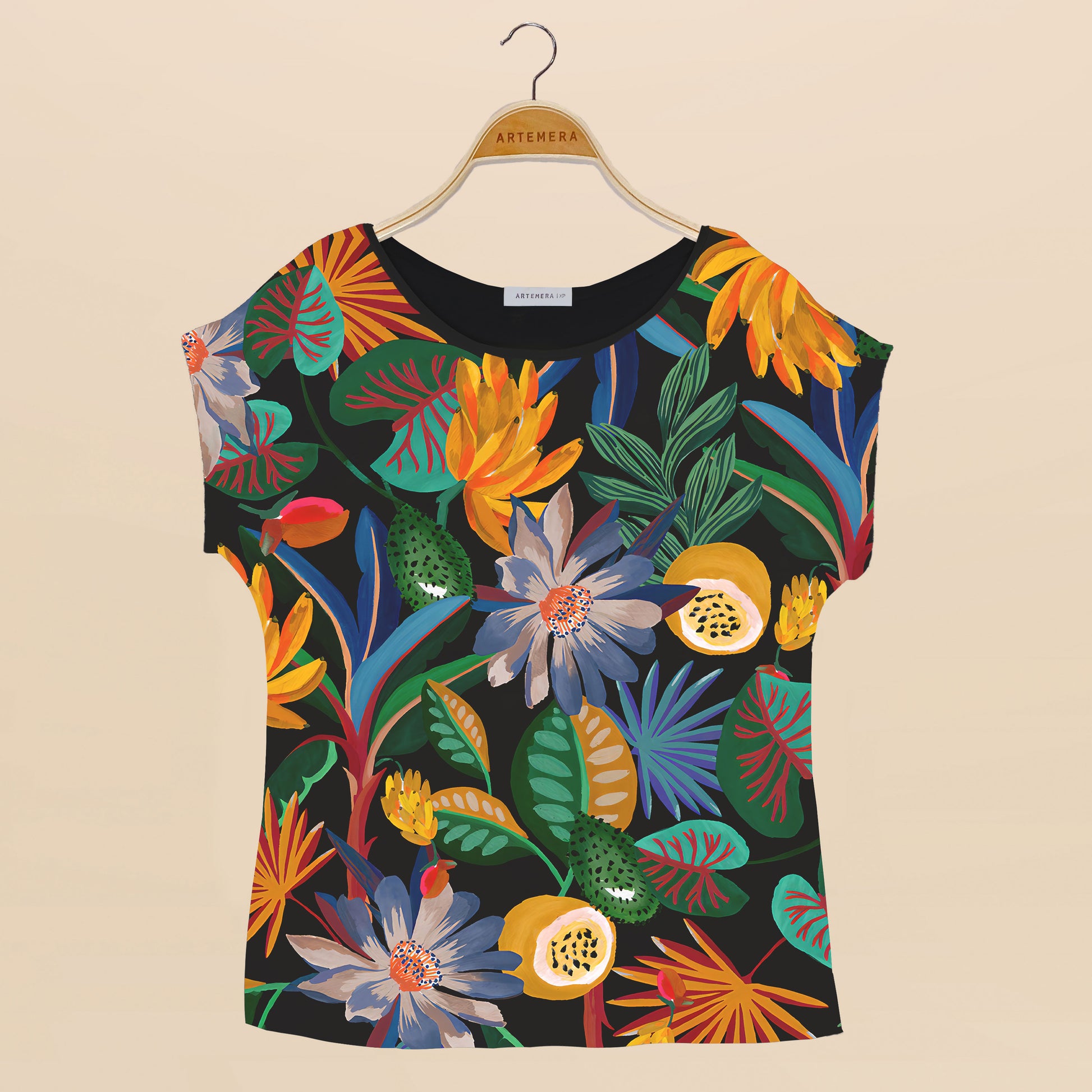 Diseño floral en el centro estampado en nuestra blusa negra, de mangas japonesas y tajos a los lados :)