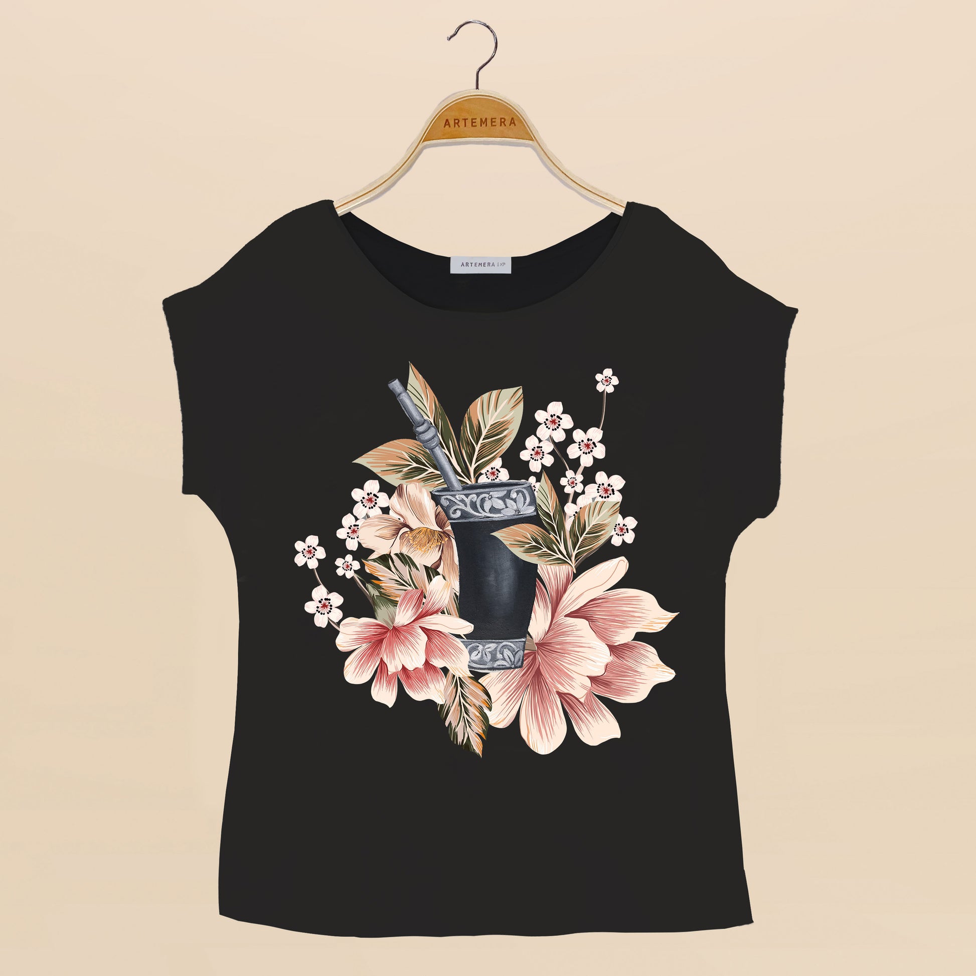 Blusa para mujer con diseño de guampa de tereré entre randa de ñandutí y flores.