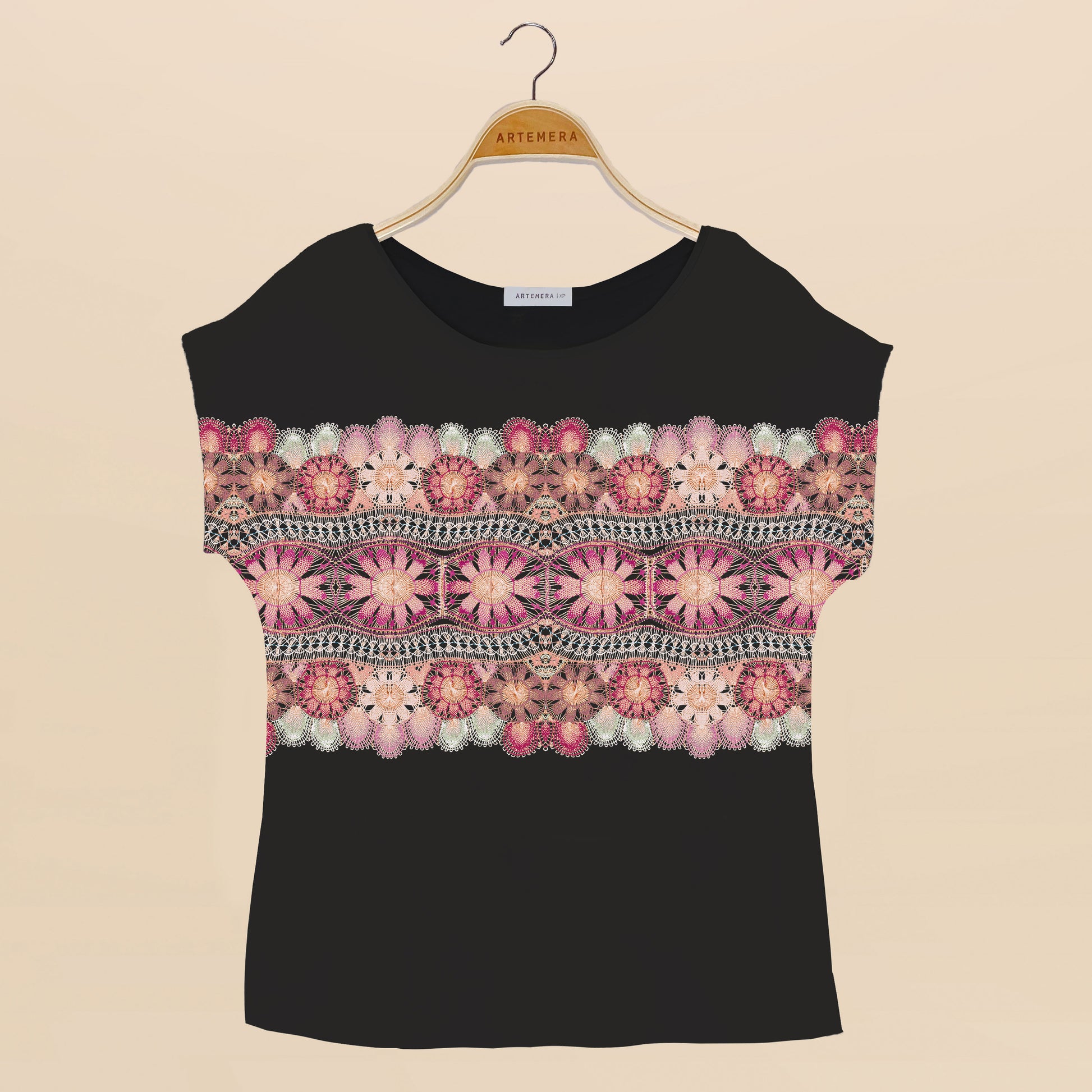 Blusa para mujer con diseño de guampa de tereré entre randa de ñandutí y flores.