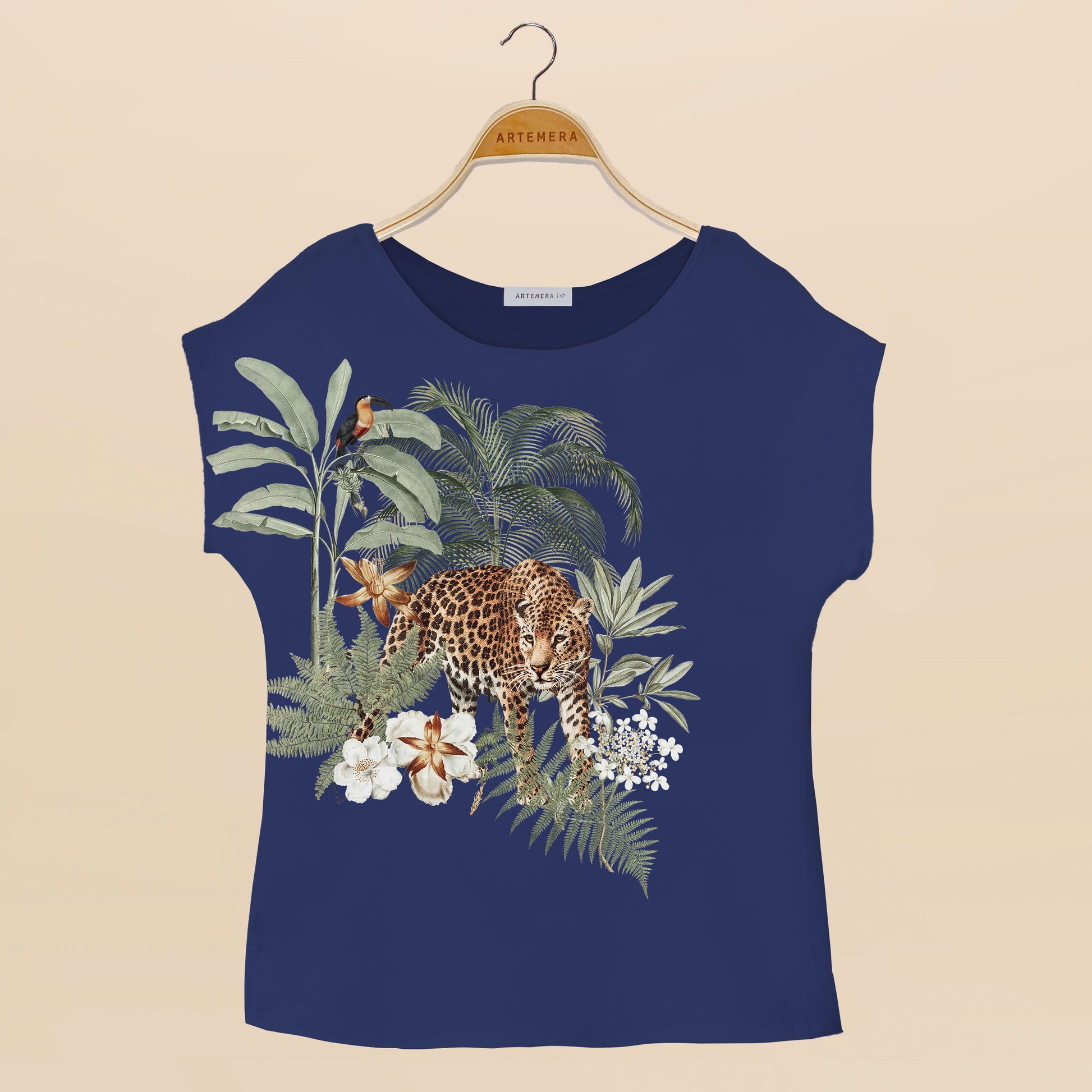 Diseño del majestuoso yaguareté, estampado en nuestra blusa azul de manga japonesa y tajos a los lados.