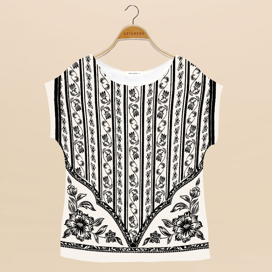 Diseño con trazos como nos encanta 😍 En nuestra blusa marfil de manga japonesa y tajos a los lados.