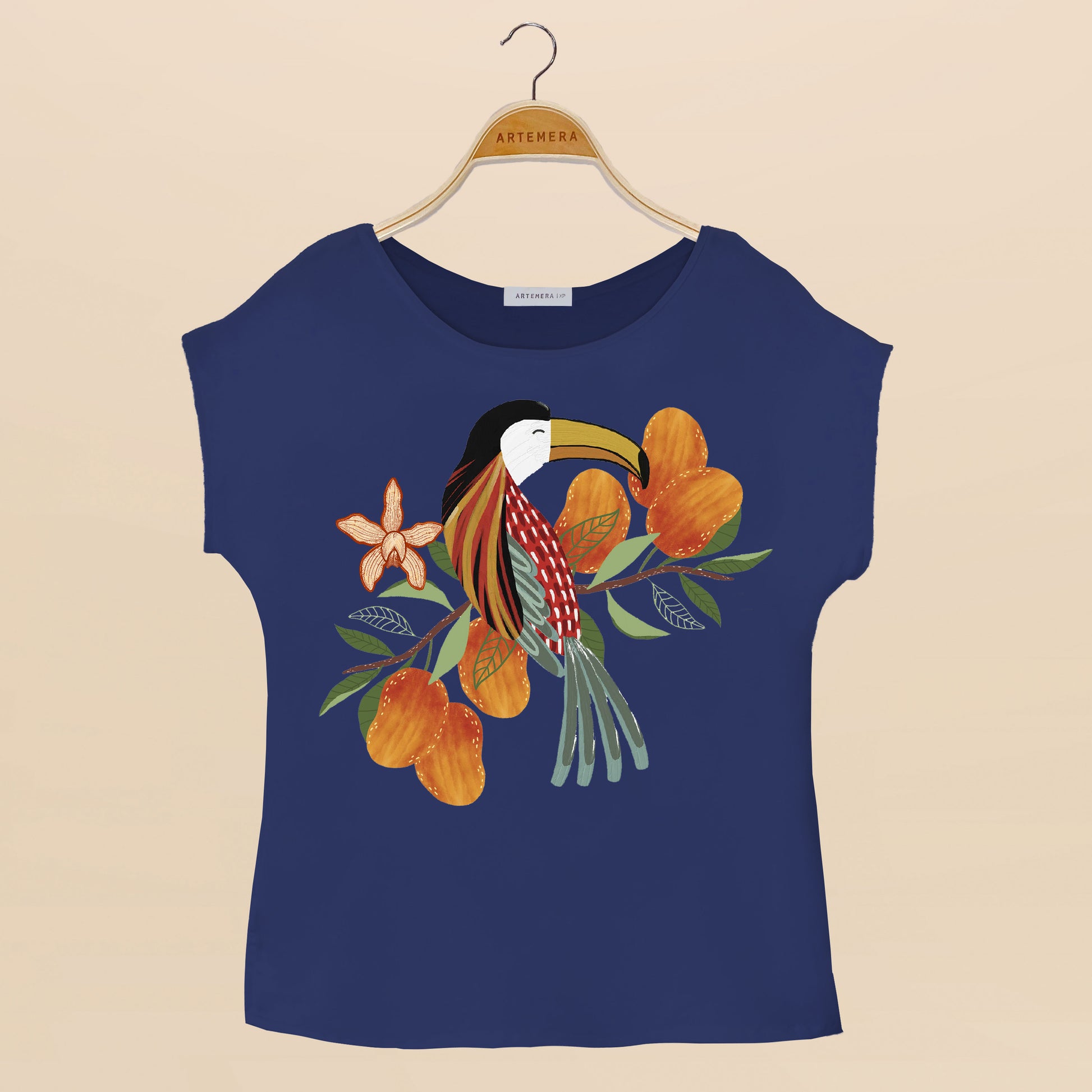 Nuestro diseño con un aire tropical y colorido que se estampa en la blusa azul de manga japonesa y tajos a los lados :)