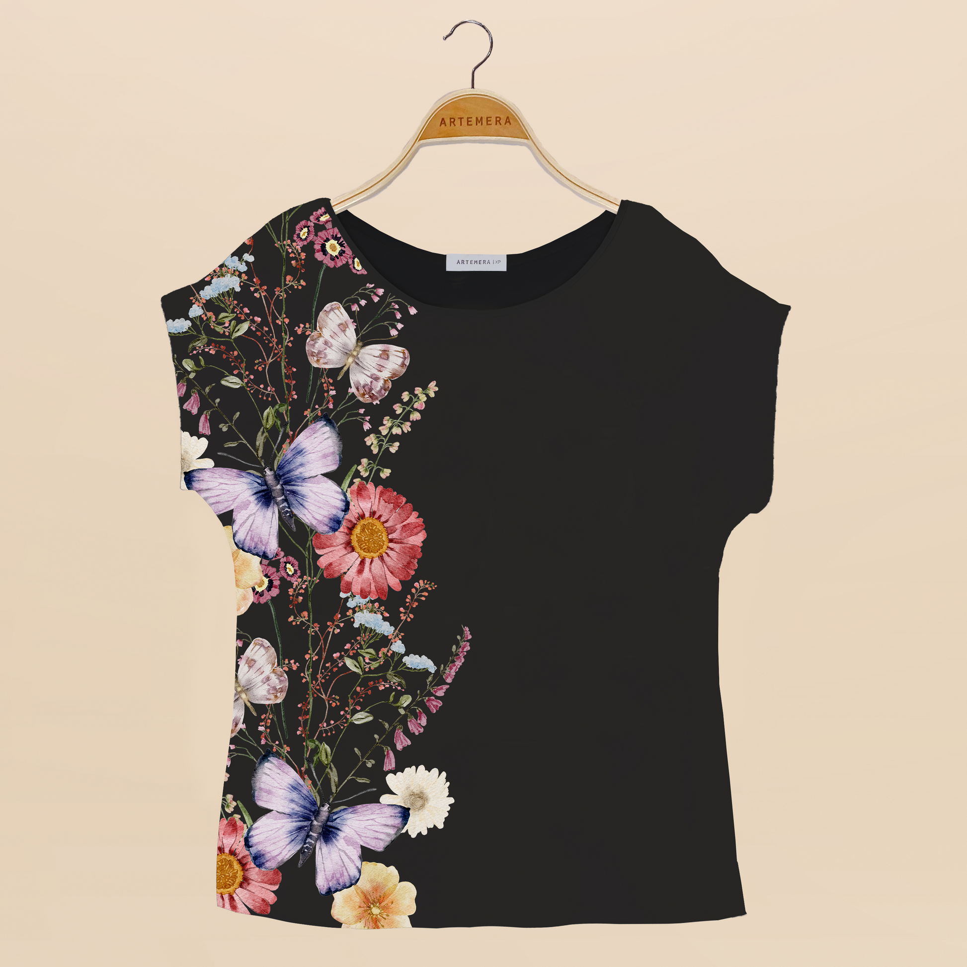 Diseño floral que se estampa en nuestra blusa de manga japonesa y tajos a los lados.