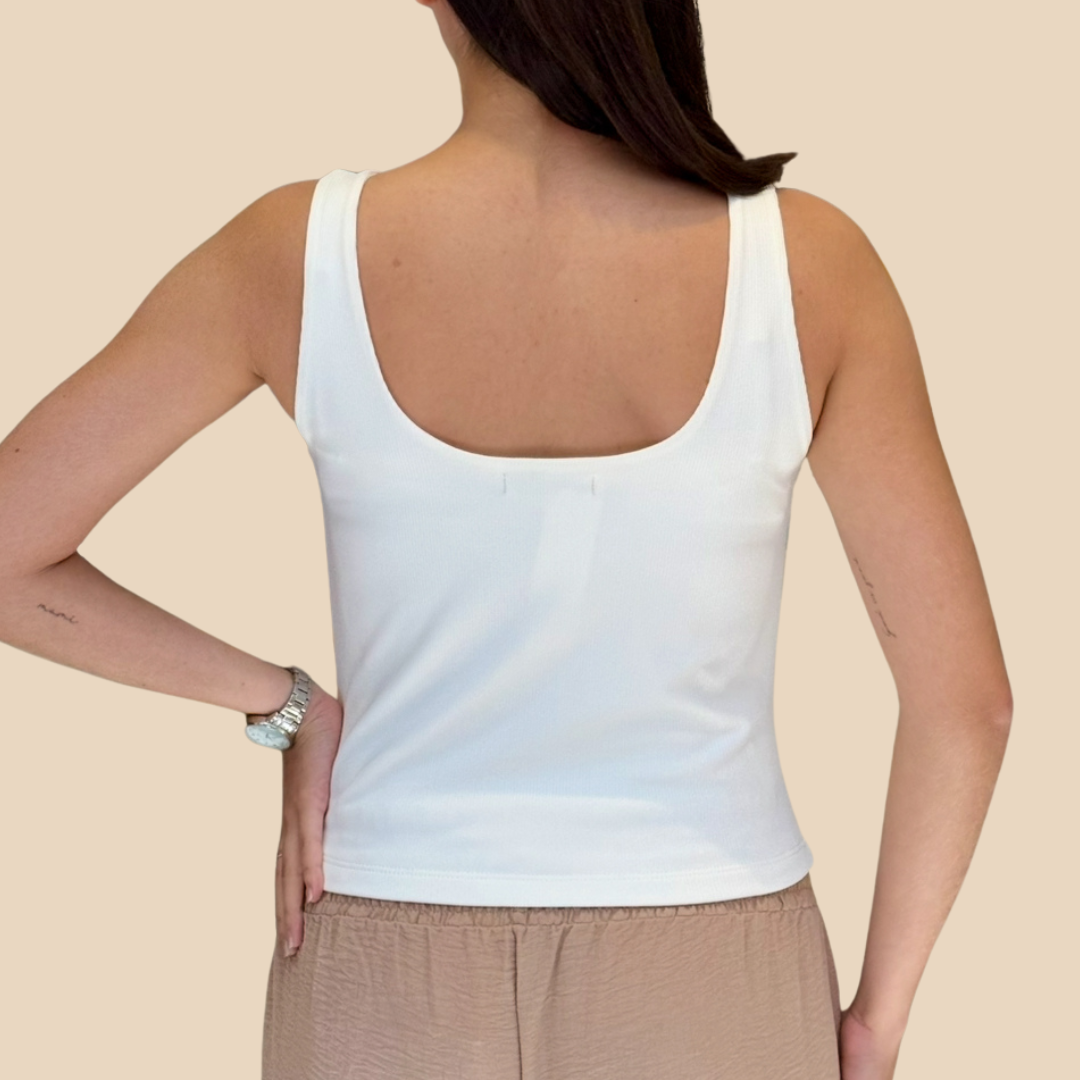 Tejido Rib elastizado que no se arruga y una confección pensada al detalle: escote cuadrado con tiras anchas cómodas para todos los días ✨