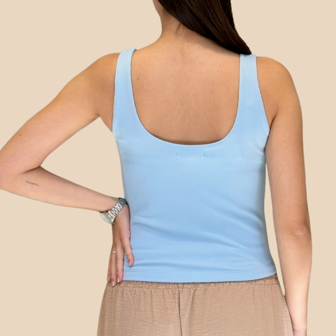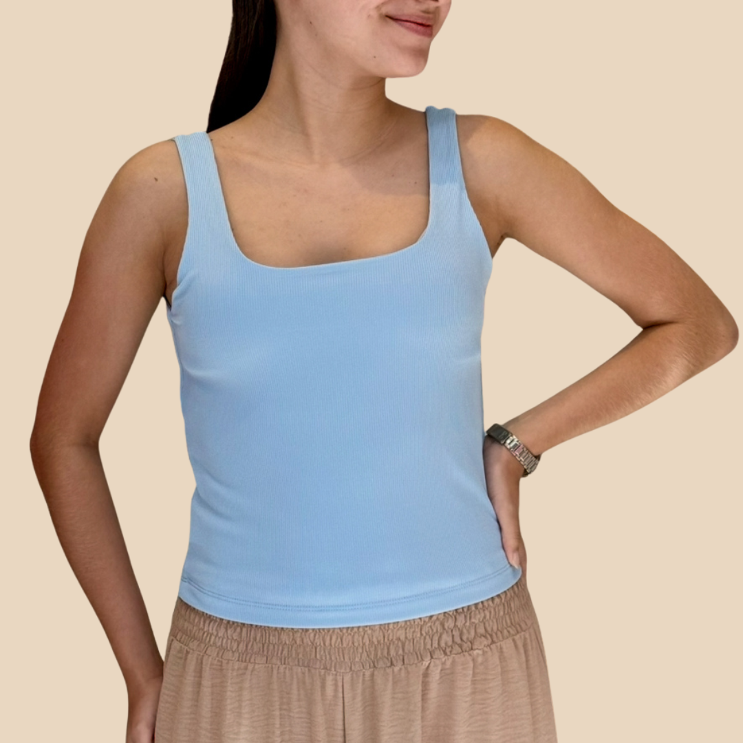 Tejido Rib elastizado que no se arruga y una confección pensada al detalle: escote cuadrado con tiras anchas cómodas para todos los días ✨