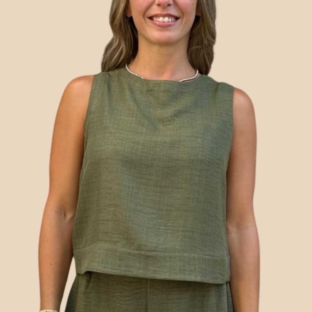 Blusa sin mangas con escote redondo y silueta holgada ✨ Diseñada con botón en la espalda y un largo ideal para combinarla con el pantalón Antonia 😉