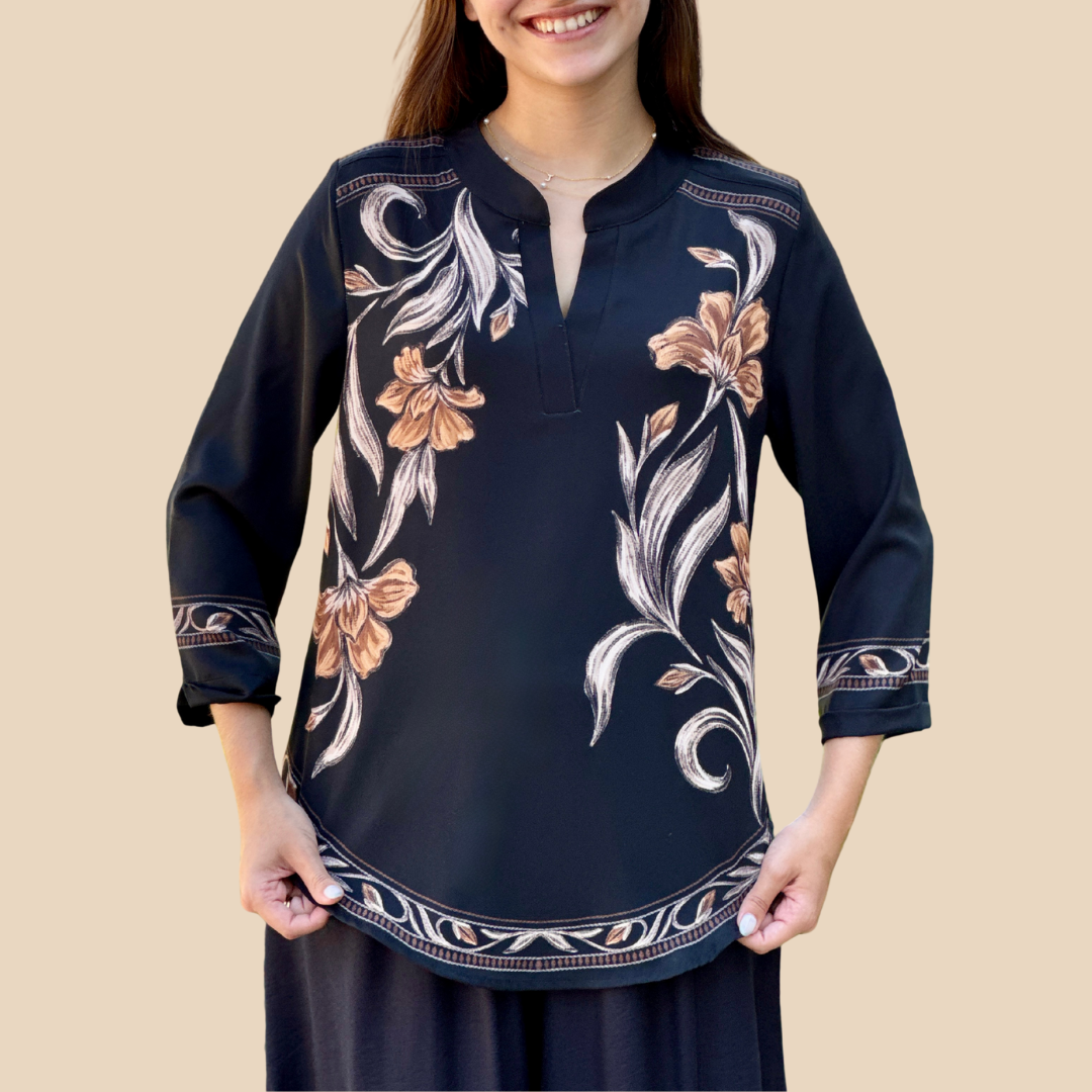 Camisa de gasa, mangas 3/4 y cuello V. Esta camisa ofrece una caída fluida y una textura suave, el tejido proporciona un brillo sutil que realza el color.