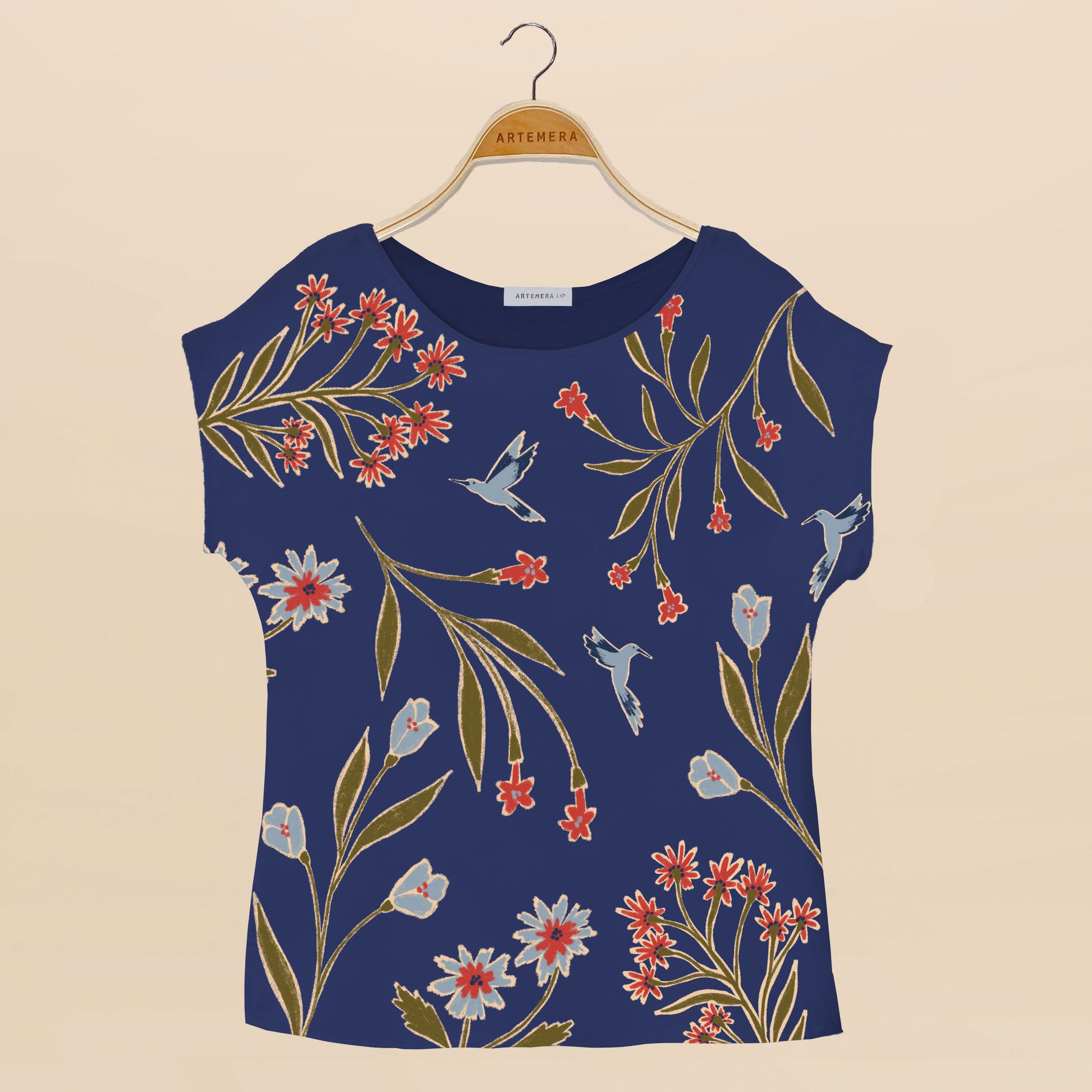 Diseño de flores que se estampa en nuestra blusa azul de manga japonesa y tajos a los lados :)