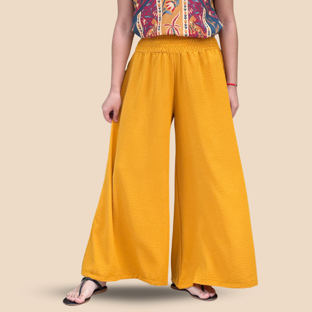 El palazo cintura alta mas cómodo con una banda elástica fruncida, cómodo y flexible para distintas tallas. El tejido ligero y de gran caída crea una silueta estilizada y relajada.