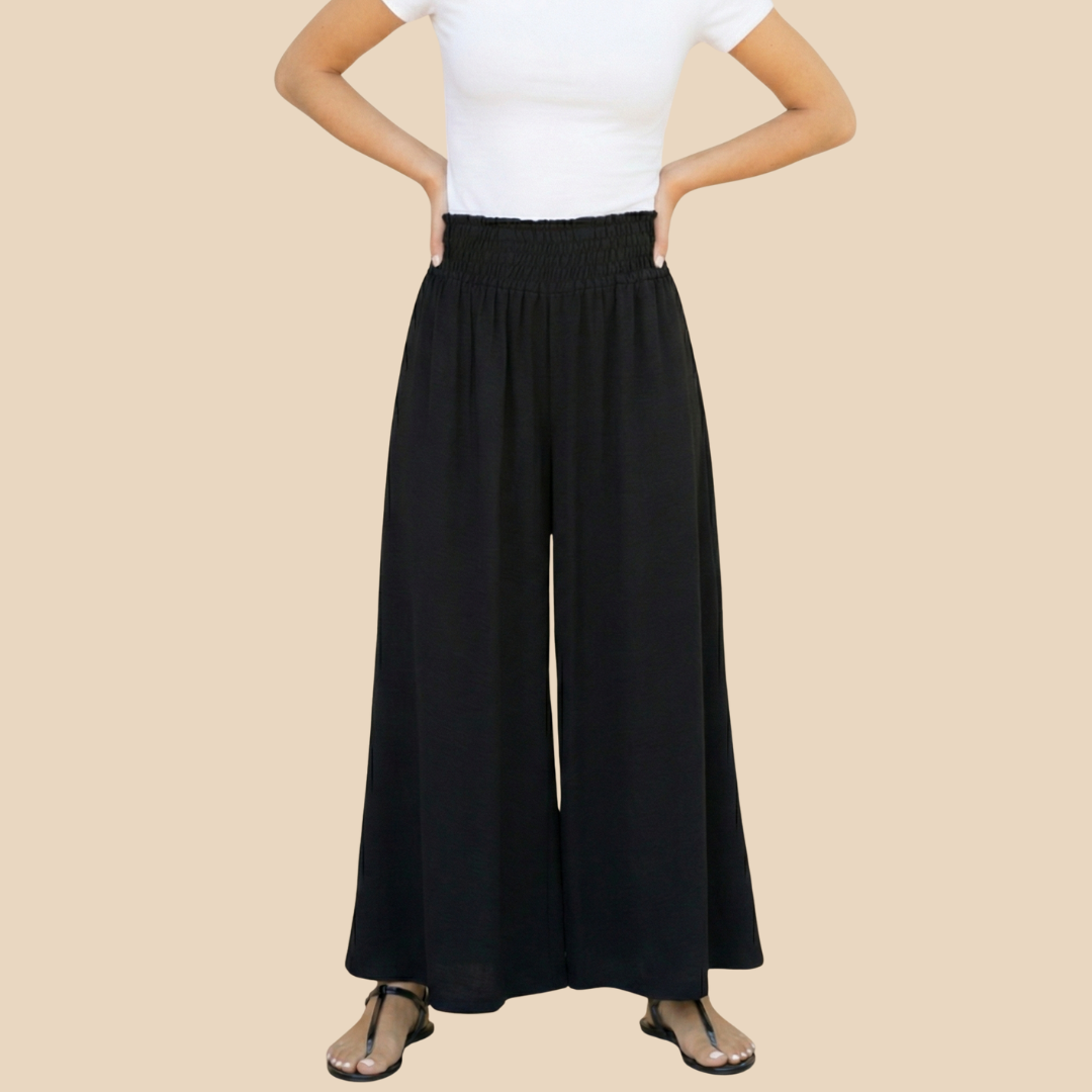 El palazo cintura alta mas cómodo con una banda elástica fruncida, cómodo y flexible para distintas tallas. El tejido ligero y de gran caída crea una silueta estilizada y relajada.