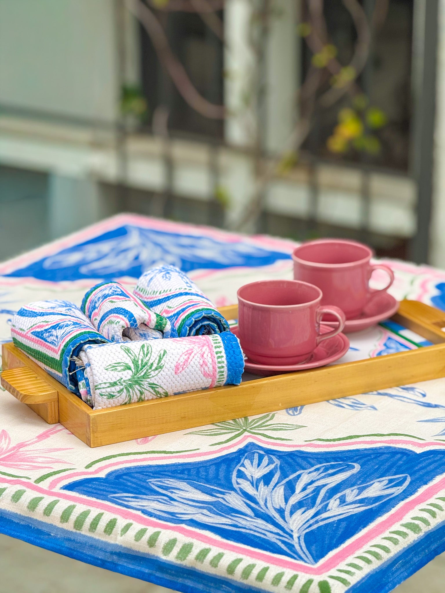Incluye una bandeja, cuatro individuales doble faz y dos delicadas piezas de cerámica.