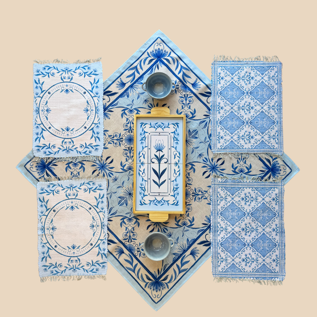 Incluye una bandeja y azulejos con diseños exclusivos, cuatro individuales doble faz hechos en poyvi, dos delicadas piezas de cerámica y un mantelito de 90x90 cm para completar la mesa.