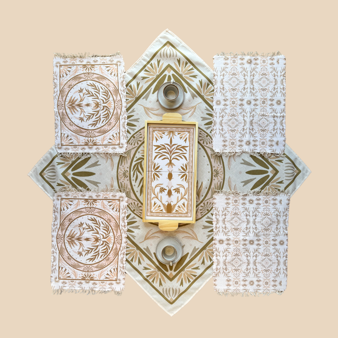 Incluye una bandeja y azulejos con diseños exclusivos, cuatro individuales doble faz hechos en poyvi, dos delicadas piezas de cerámica y un mantelito de 90x90 cm para completar la mesa.