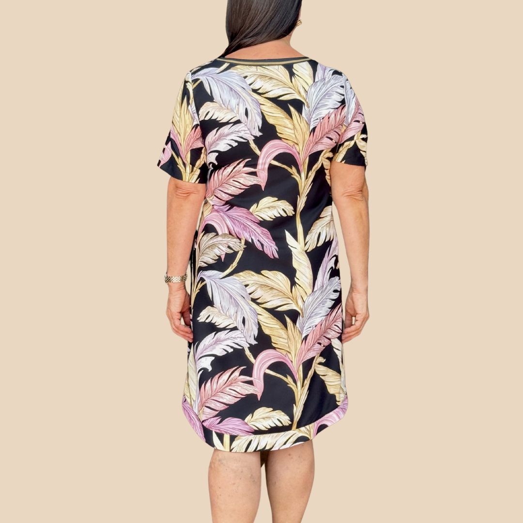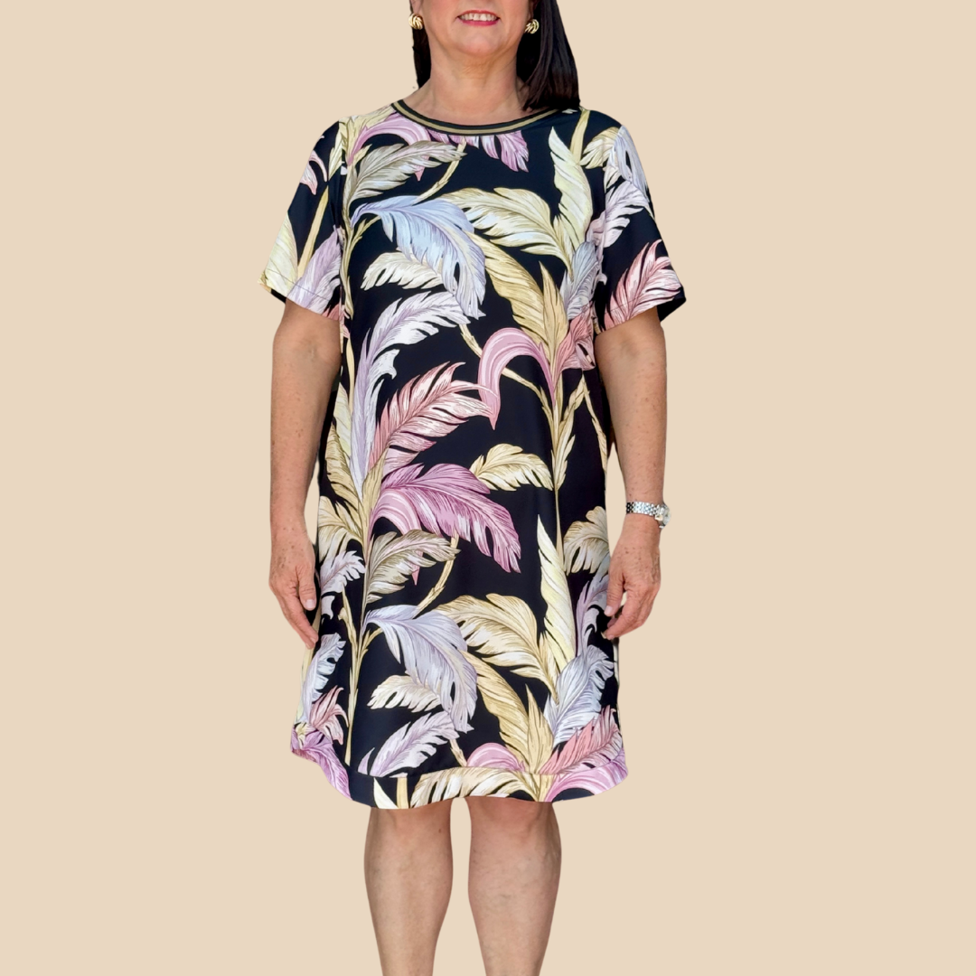 Vestido túnica con cuello rib y mangas cortas, estampado como nos encanta.