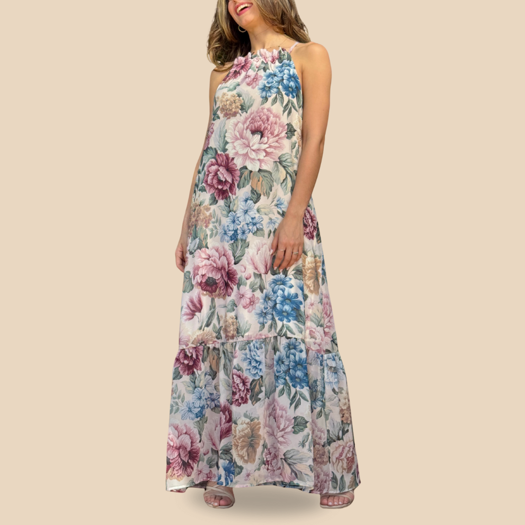 Vestido largo de cuello halter, con diseños exclusivos que reúnen elementos y colores que nos encantan.