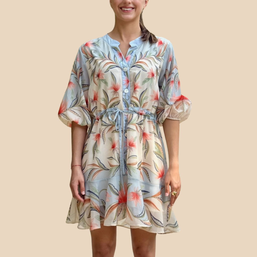 Vestido corto perfecto para los días relajados. Con un escote sencillo y botones al frente, con cinto para atar en la cintura y darle un toque más personalizado.