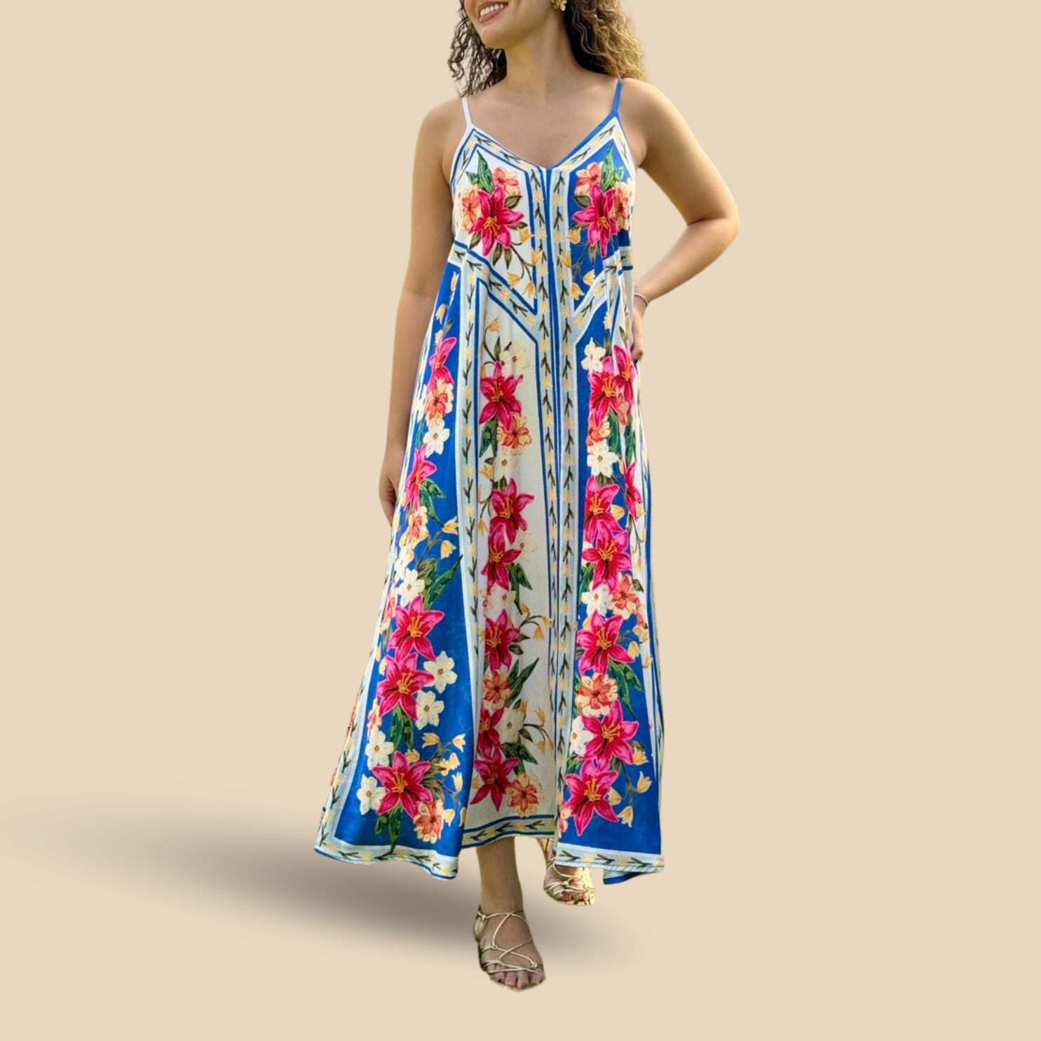 Vestido largo sin mangas, con escote en V, tiras ajustables y espalda abierta con listón para atar 💛