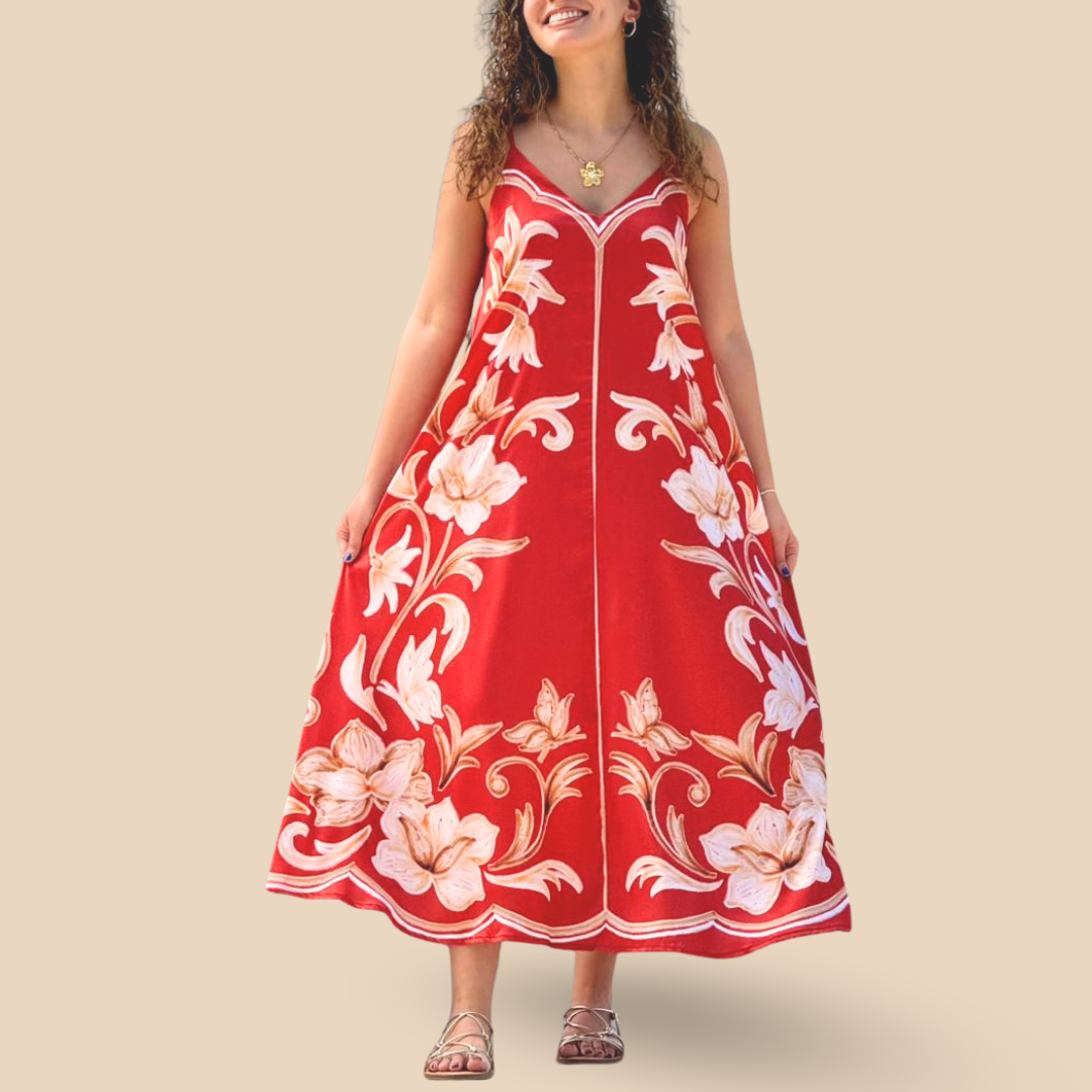 Vestido largo sin mangas, con escote en V, tiras ajustables y espalda abierta con listón para atar 💛